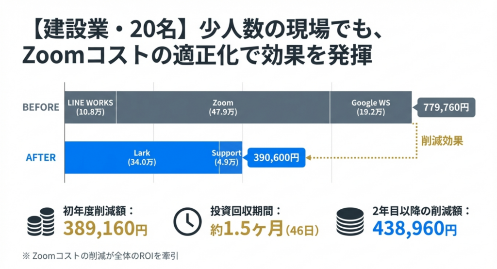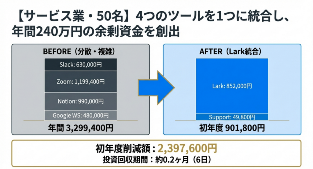 削減の主な要因は、**「Larkへのツール統合」**です。月額1,420円のLark有料版一つで、チャット、ビデオ会議、ドキュメント管理、メールなどの機能を網羅できるため、個別に契約していた各ツールのライセンス料を大幅にカットできます。