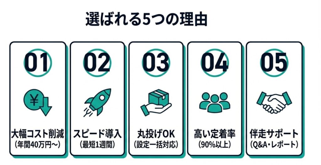当社が初期設定から運用まで丸投げ対応いたします。御社の作業は、ヒアリング対応と確認・承認のみ。技術的な知識は一切不要です。導入後も、1ヶ月間サポートで、操作に関する質問に無制限で対応いたします。
