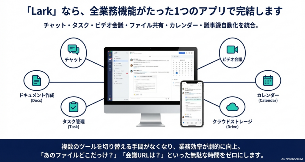 Larkは複数機能を1つに統合できるため、ツールの役割が重複している部分を整理しやすくなり、費用と運用負担の両面で“ムダ”を減らす判断がしやすくなります。