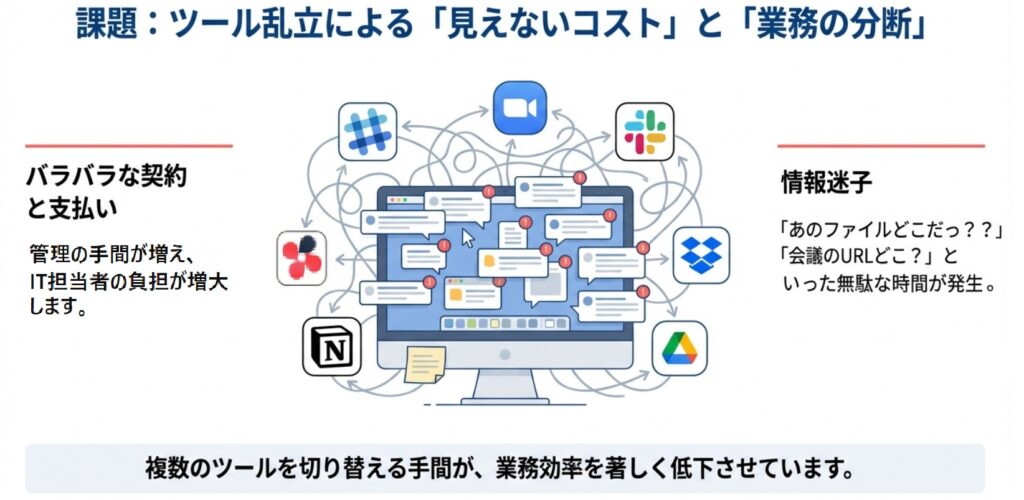 複数ツールを行き来する状態は、探す時間・切り替えの手間(スイッチングコスト)を生み、集中力も落ちやすくなります。
